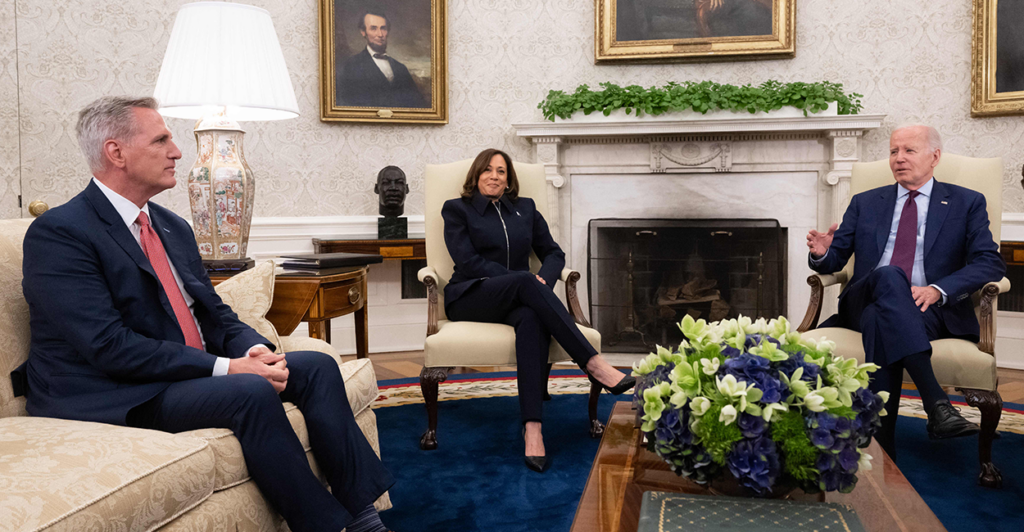 President Joe Biden and Vice President Kamala Harris met with congressional leaders at the White House on Tuesday to discuss raising the debt ceiling as the U.S. inches closer to a potential default on the national debt in the coming weeks.
