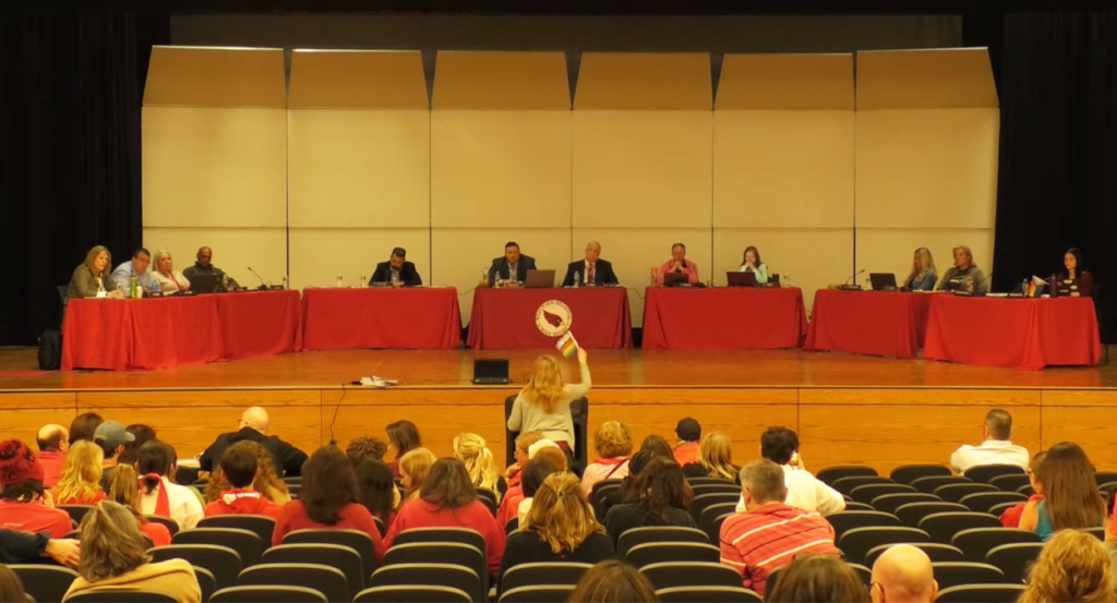 Many protesters at the May 11 meeting also accused the school board of “dehumanizing an entire community of people,” as one speaker put it, because it appointed a committee to examine the district’s sex education policy and to determine whether teachers may promote LGBTQ+ topics in elementary classrooms.