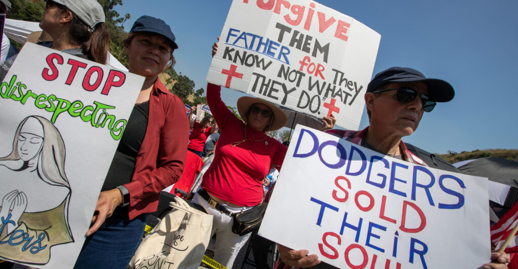 Outside, a sea of people railed against the team’s decision to partner with a group that most Americans consider wildly offensive. The Sisters, who get their jollies dressing up like drag nuns and pole dancing on crosses, is apparently the Dodgers’ idea of a solid, community-centered “ministry.” Despite weeks of ferocious grassroots pushback, the team went forward with the award—to the outrage of national Catholics.