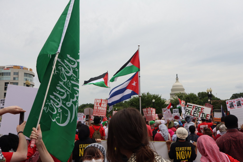 Support for Middle Eastern terrorist groups was abundant at Wednesday’s demonstrations. The Daily Signal documented signs, T-shirts, flags, and other items with images representing Hamas, its Oct. 7 massacre in Israel, a Palestinian terrorist who hijacked planes, and more.