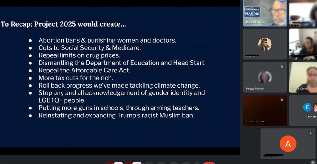 In Georgia on Friday, Maya Carter and David Samuel led an information session on Project 2025, describing it in a slideshow as “the 922 Page Conservative Plan to Give Trump More Power Over Your Daily Life, Gut Democratic Checks and Balances, and Consolidate Power in the Oval Office.”