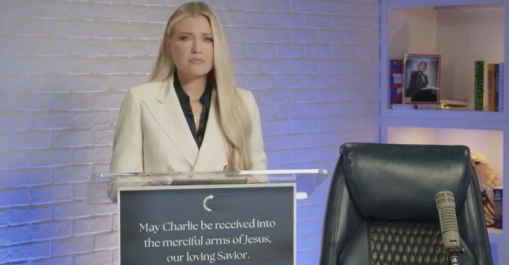 She spoke for just under 18 minutes from the studio where Kirk conducted his weekday podcast, in front of a podium with a picture of Charlie Kirk which said above it, “May Charlie be received into the merciful arms of our loving savior.”